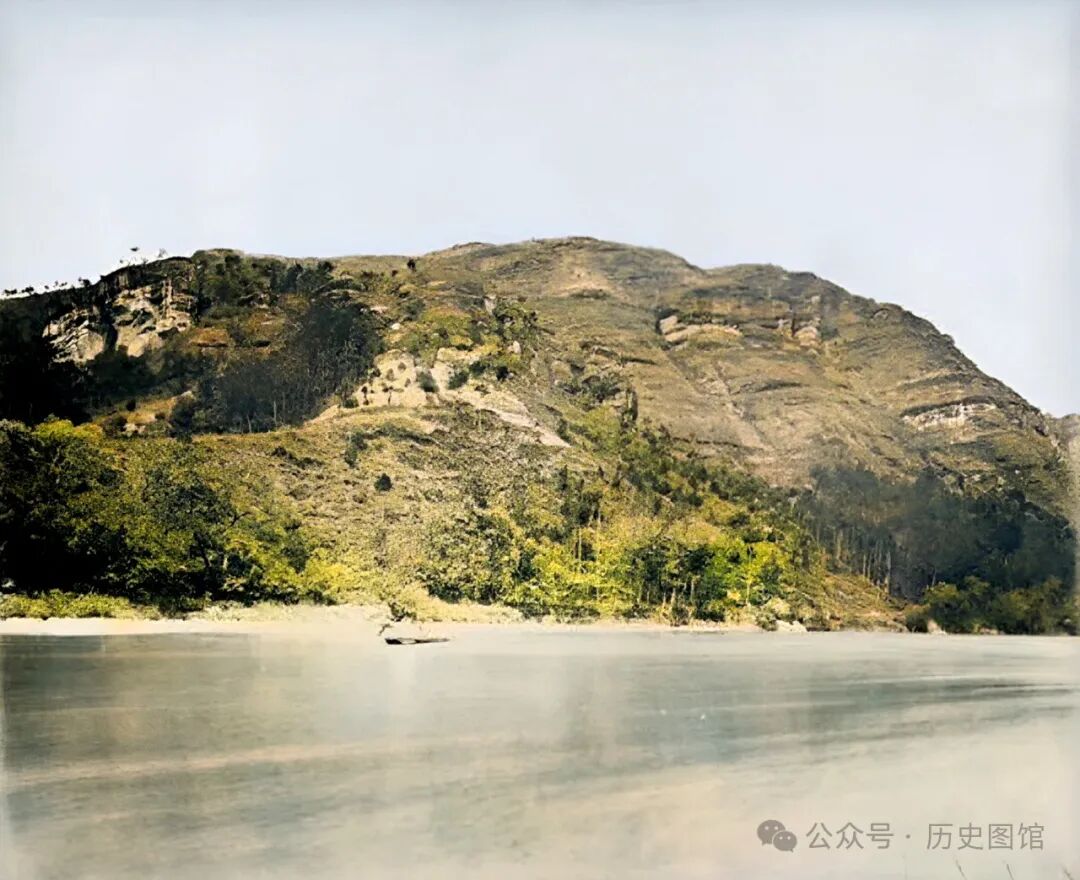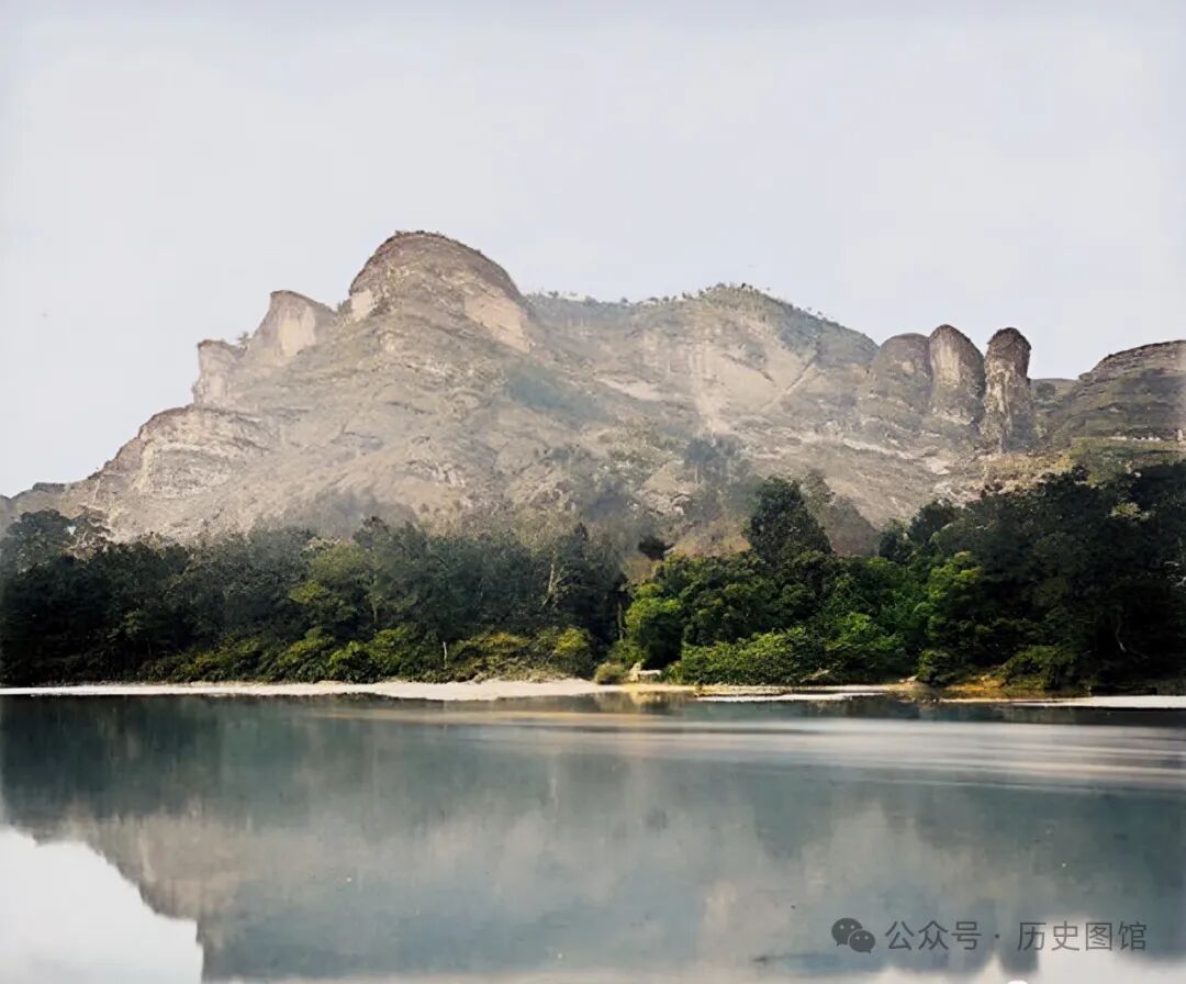100多年前的武夷山,风光古朴自然,山脚下长满了灌木和树丛。水流平稳,远处,岩石山体倒映在水中,分不清哪个是实景,哪个是幻境。这样的美景,只有在武夷山才能欣赏到。