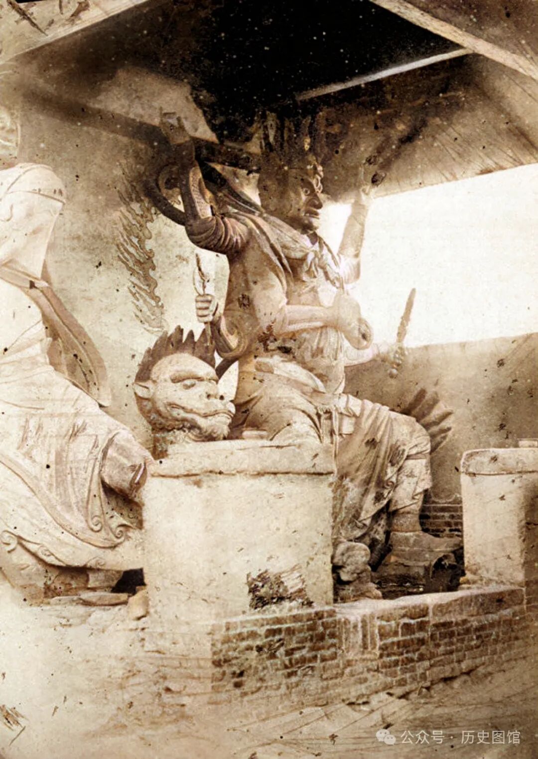1875年,洋县境内的一座寺庙。在庙内的台子上有几尊神像,长着三头六臂,神态动作富有张力。有人说这是洋县的开明寺。不过,并没有找到关于这张照片的其他文字信息,寺庙的名字无法考证。