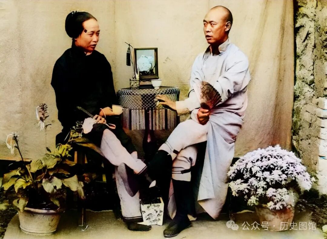 这是汉中一对中年夫妻的合影照。两人坐在一个圆几旁,都翘着二郎腿。女子手里端着茶盏,男子手里拿着折扇。四目相对,两人的表情耐人寻味。在过去,能拍这样照片的,都不是一般家庭。
