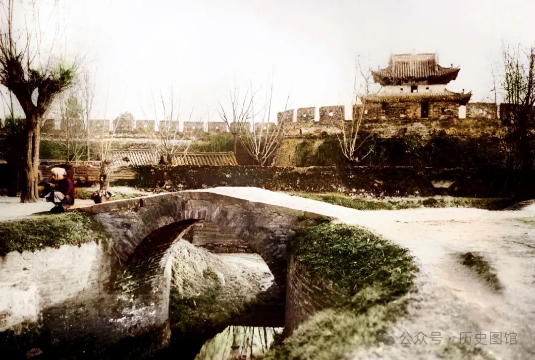 清朝末年,位于汉中南门瓮城外的景象。近处是一座砖券小拱桥,桥头坐着一名男子在休息。桥下只有很少的水。