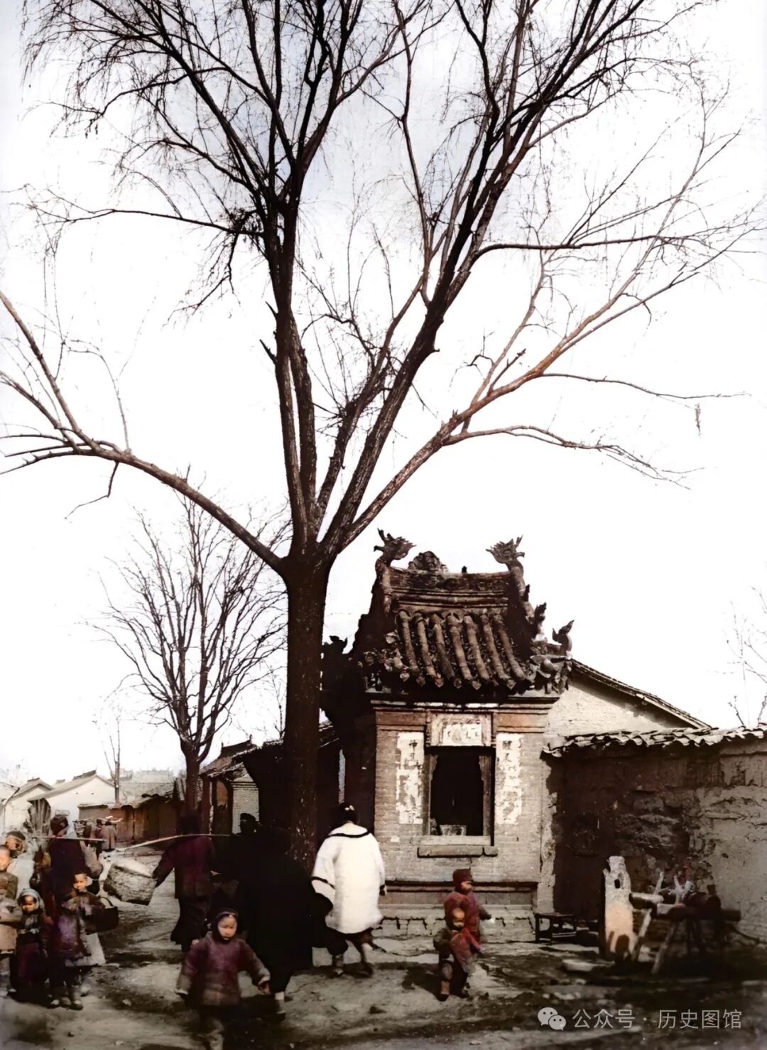 龙王庙旁的这条小街很热闹,行人熙熙攘攘。不时有小贩挑着扁担从街上走过。一名女子带着孩子在龙王庙旁的大树下玩耍。