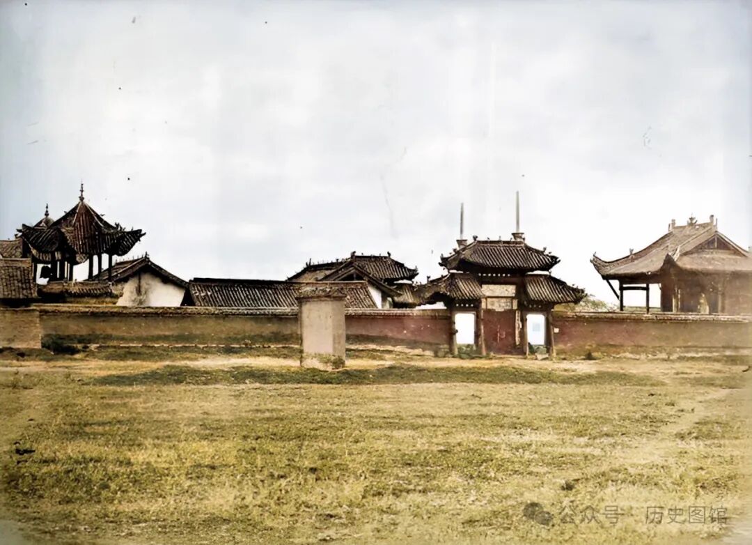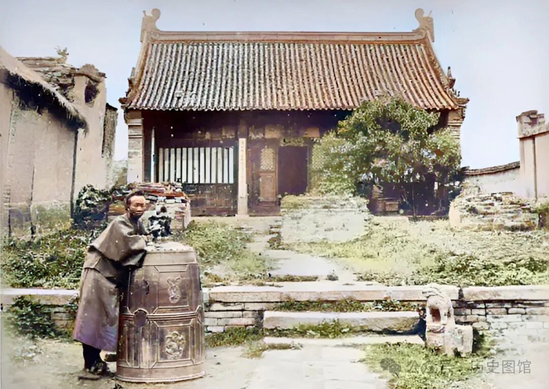 1875年,汉中府地方官府院内景象。院内主体建筑面阔五间,房前建有汉白玉栏杆。在正屋的房檐下,悬挂着“廉洁清正”的匾额。在正屋的两侧,各有一间小房子,可能是马棚。整个院子看起来有几分破败。