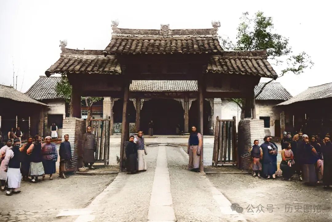 1904年,汉中城固县衙门的牌坊前,站满了百姓。当时,衙门刚审讯完犯人,围观百姓还没有散去。看到有摄影师对着他们拍照,都好奇地站在旁边张望。在县衙门牌坊下,左右各立着一个木笼,这是用来囚禁犯人的。