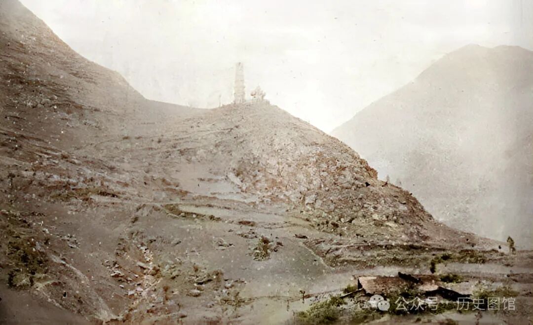 清朝末年,略阳县城附近山上的宝塔。看上去像是南山塔。南山塔,又名略阳塔。为六角七层阁楼式砖塔,是略阳的标志性建筑。南山塔始建于清刀道光三十年(1850年)。二层正面镶嵌塔铭一块,上书“福地祥云”。