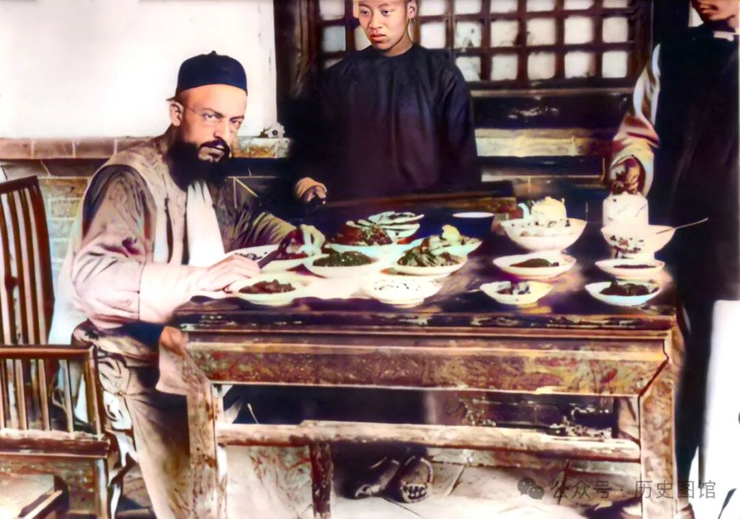 照片中这个坐在桌前吃饭的外国人,就是南怀谦(意大利人),他是一名在中国的传教士。南怀谦经常身穿中国传统服饰,头戴瓜皮帽。
