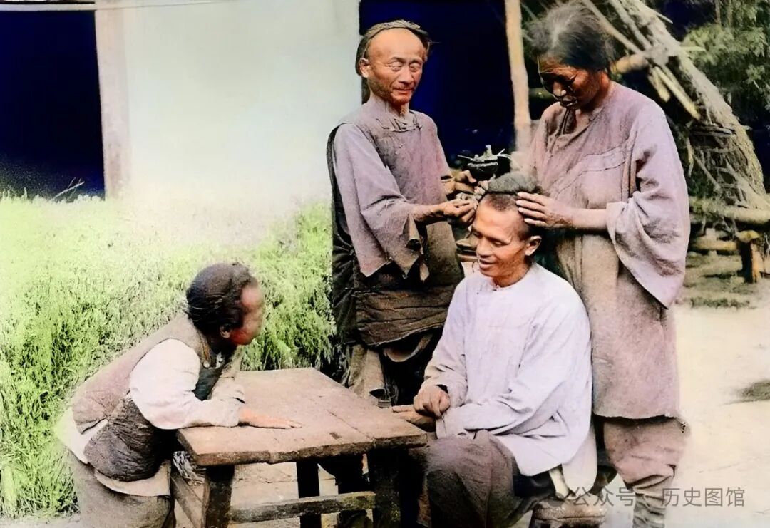 清朝时期的人们,都有长长的的发辫。不论男女,都要经常整理发辫。照片中,这一家人过着平凡的日子,其乐融融。