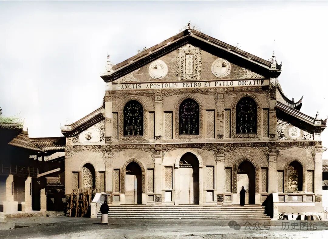 这是位于汉中城固县古路坝村的一座教堂。教堂坐落在村边的一个山丘上,建筑采取了中西合璧的风格。有欧式的立柱,也有中式的飞檐。该教堂在上世纪70年代被拆除。现在,我们也只能从南怀谦拍摄的老照片中一睹它的身影了。