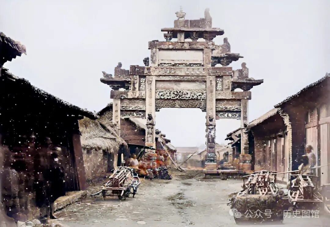 这是汉中城内的一座跨街三间四柱石牌坊,看上去有些年头了。牌坊上部有些组件已经破损脱落。横梁和立柱上雕刻着精美的浮雕纹样。街道古色古香,两侧都是商铺,有几名车夫在路边休息。