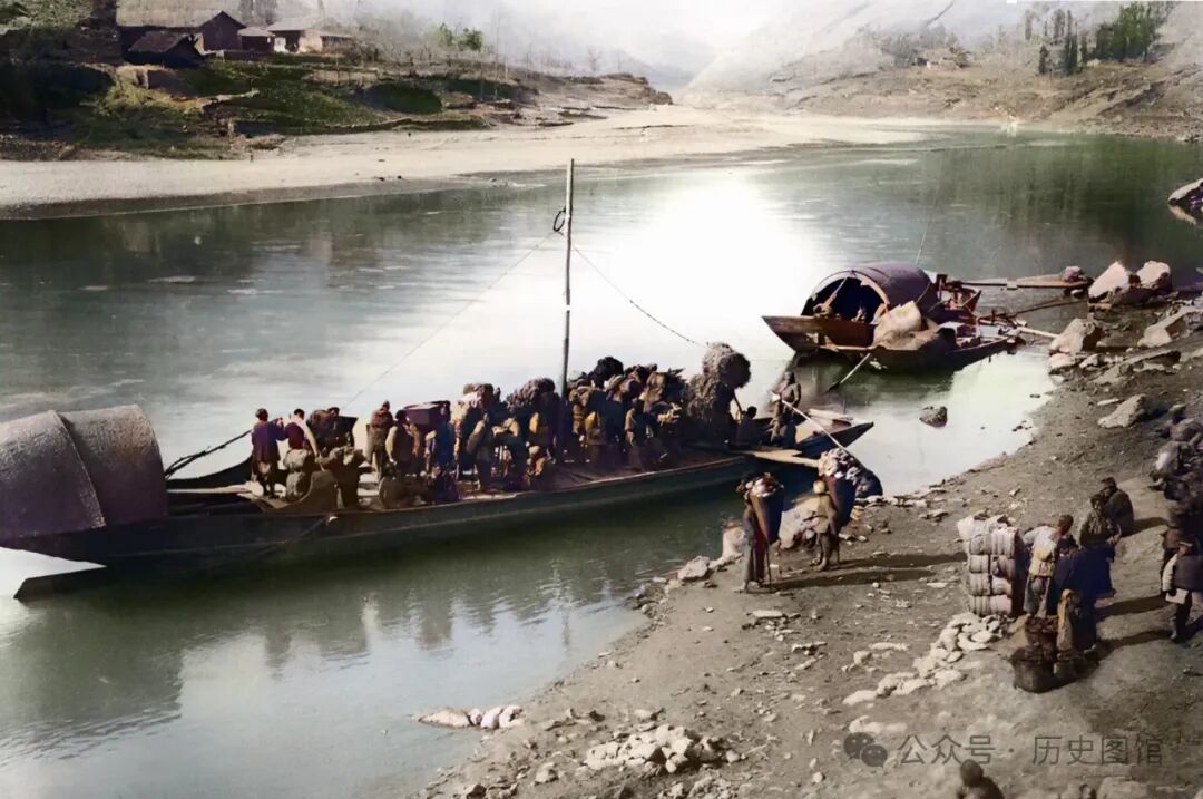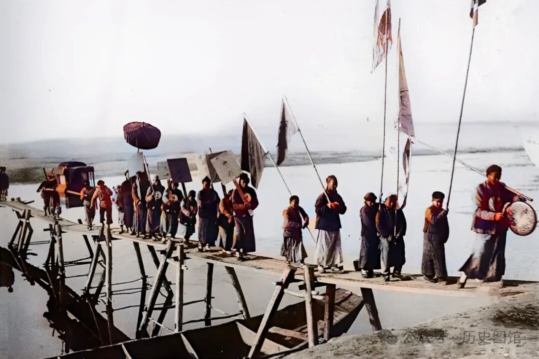 清朝末年,陕西汉中一官员出行时的场面:一顶四抬大轿正在通过河上的木桥。走在前面的衙役,有的手举华盖,有的举着肃静牌子,有的举着旗帜。