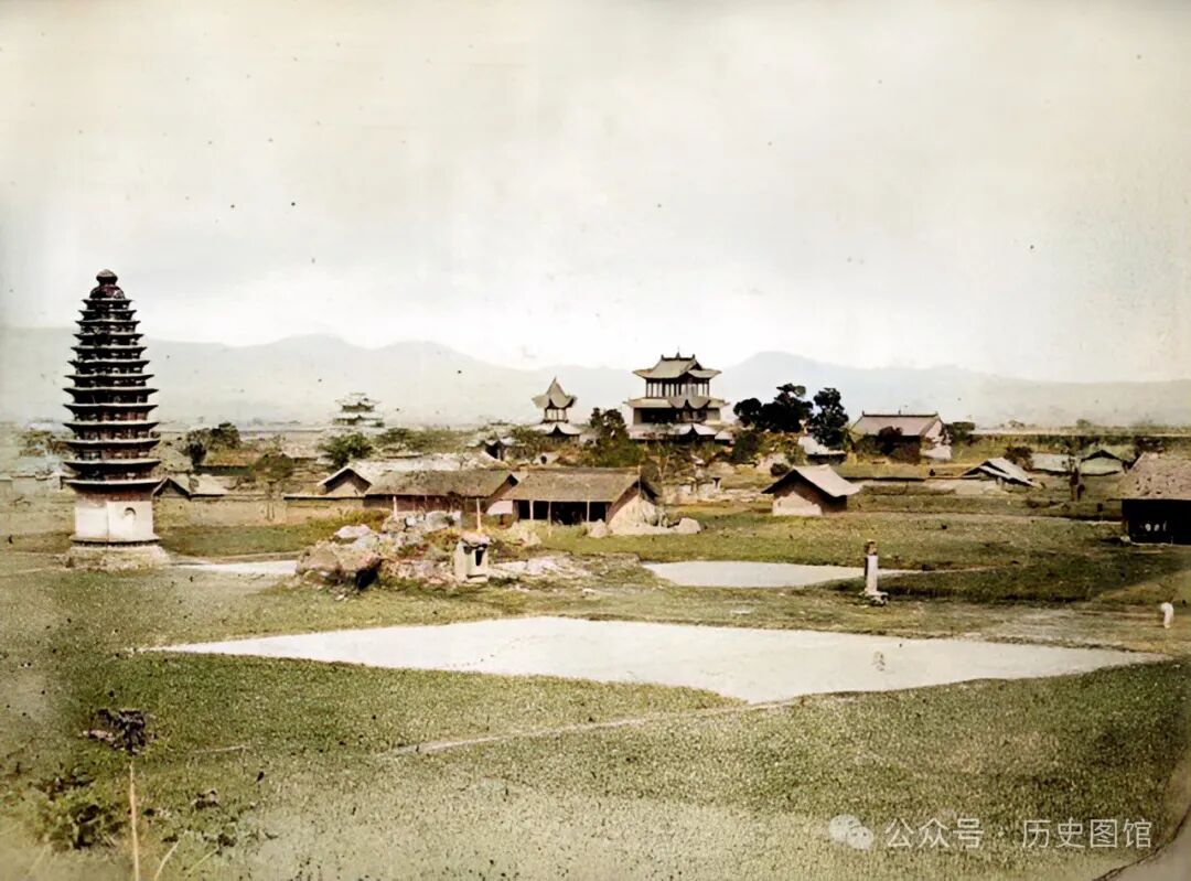 1875年,汉中洋县开明寺附近景象,左侧宝塔十分显眼。据《汉中府志》记载,寺塔均始建于唐开元年间(713-714年),明洪武二十四年(1391年)为丛林,有浮屠高十三层。