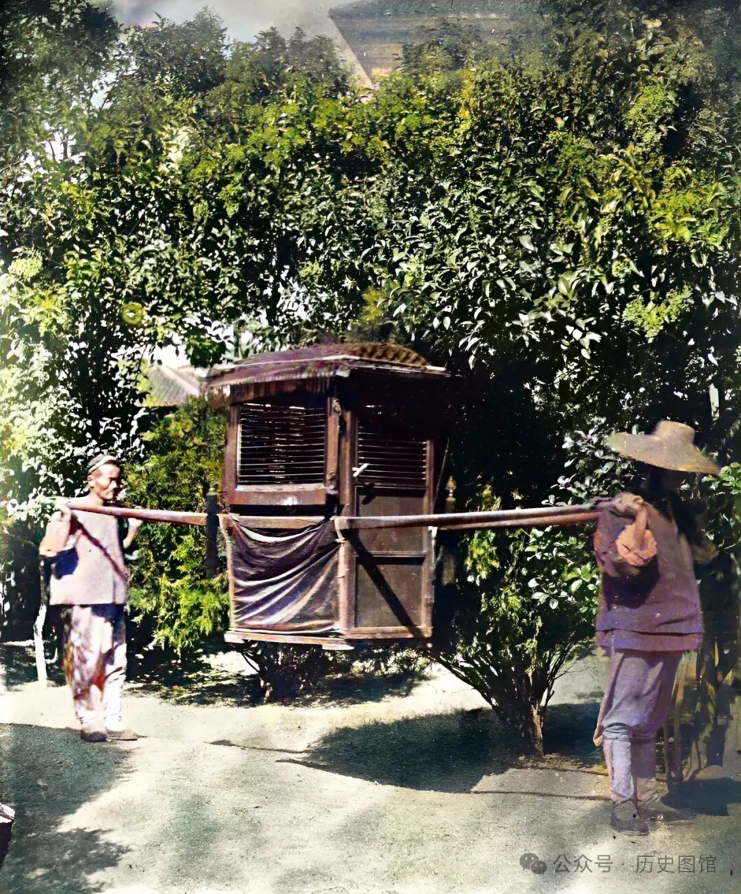 1850年,在上海的一个花园里,两名轿夫正抬着一顶轿子前行。轿子为木制,上部装有百叶窗,轿顶四周垂有流苏。轿子是比较常见的一种交通工具。像这样的轿子,一般有身份的人才能坐得起。