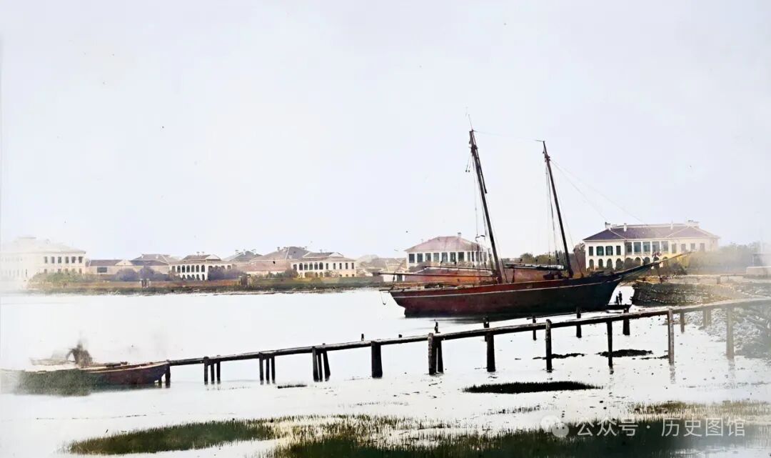 1850年,上海外滩景象。这是站在美国领事馆位置向远处眺望。最左边是渣街,最右边是英国驻上海领事馆大楼。一艘双桅帆船停靠在岸边,岸上有伸入水中的栈道。东吴溪,在照片的右边、船上桅杆的后面位置。