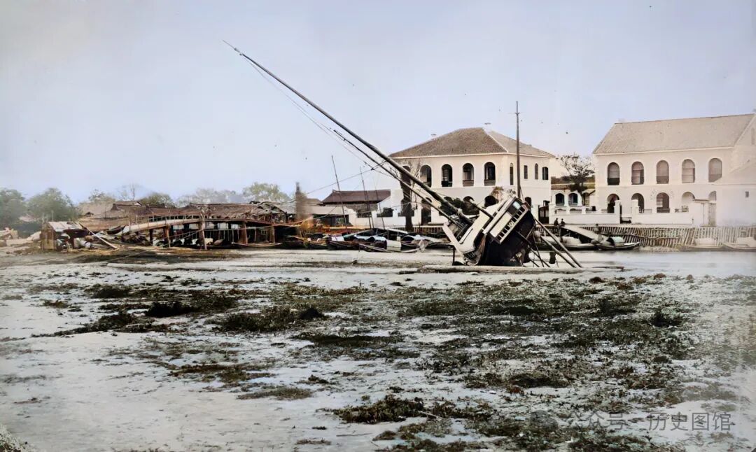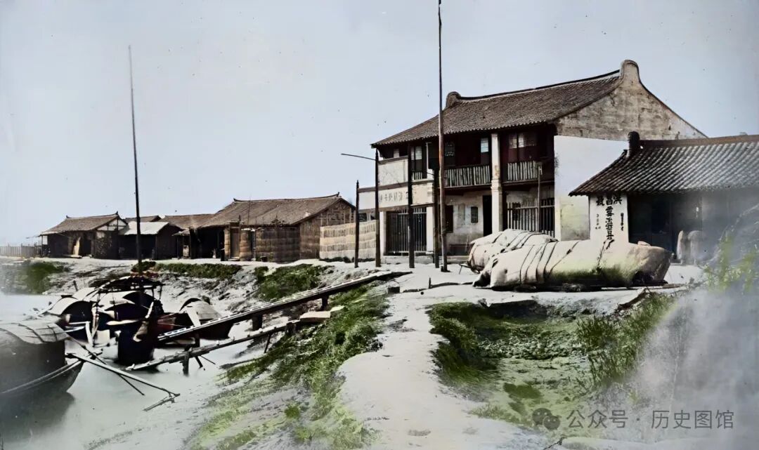 上海码头附近,美国驻上海领事馆前面的景象。河道正处于枯水期,露出了河底的淤泥和水草。一艘帆船倾斜在河底。远处,在一座拱桥边,也停着一些小船。