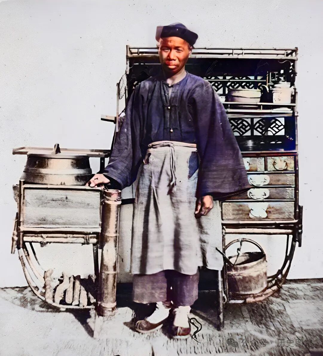 1850年,上海街头一名卖小吃的商贩。他的小吃摊设计精巧,一侧装有炉子,另一侧则是碗柜等。在过去,这样的小吃摊在当地非常普遍。可以想象,当时的上海街头,小吃摊林立香味扑鼻,充满了人间烟火气。