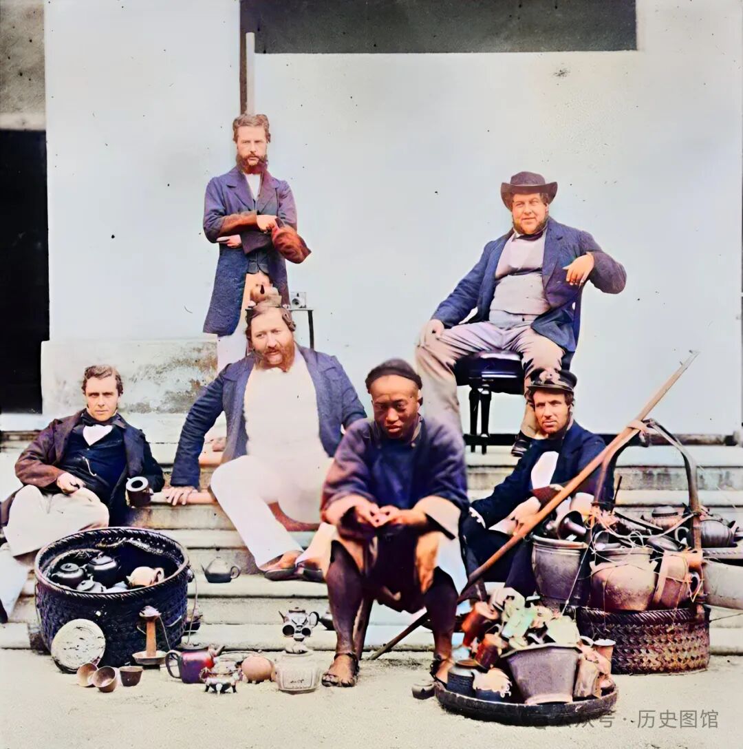 这时,几名英国人走过来,来到他的摊位前。好奇之余,他们竟然坐在小贩身后的台阶上合影留念。拍下这张照片的,也是一名英国人。