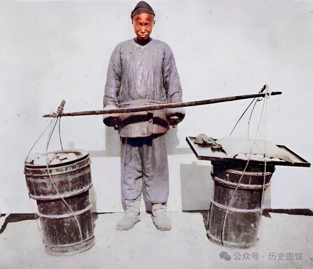 一百多年前,上海街头一名卖蛋糕的小贩。扁担两头的木桶里,装着制作好的各种糕点。这种流动小摊,在当时很常见。他们挑着担子,沿街叫卖。现在,这样的场面只有在影视剧中才能看到了。