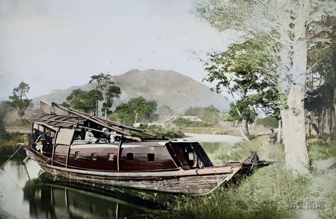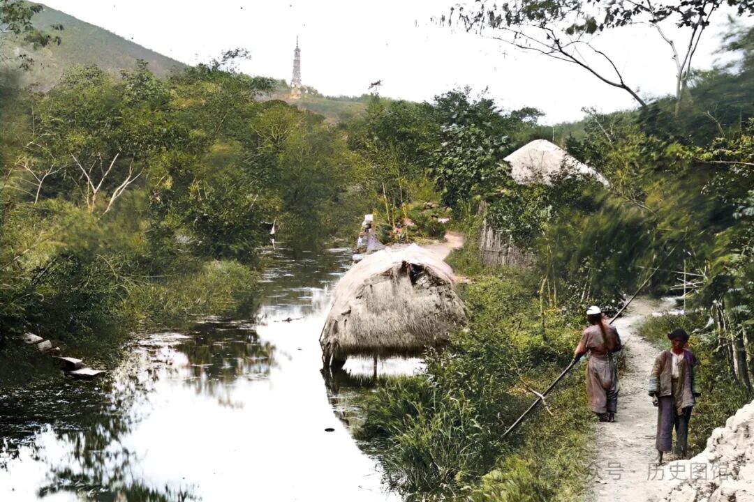 1850年,上海郊外的小溪上,停泊着一艘茅草船。远处,佘山上的千年古塔“秀道者塔”清晰可见。路边有一名男子正从河里取水,另一名男子看到有人对着他们拍照,脸上露出了好奇的表情。