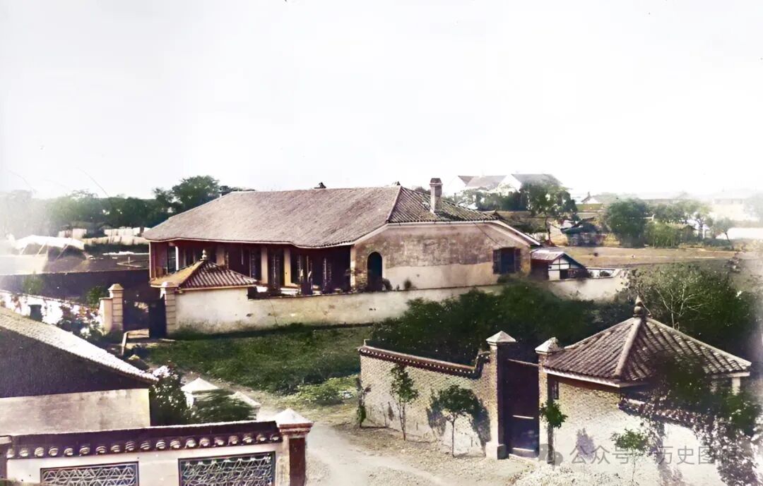 1850年,上海一处外国人的别墅区。房屋建筑都是欧式风格,照片中国最大的院子,房屋的主人是梅杰夫妇。在他们的别墅周围,还有几个别墅院落。别墅四周环境幽静。