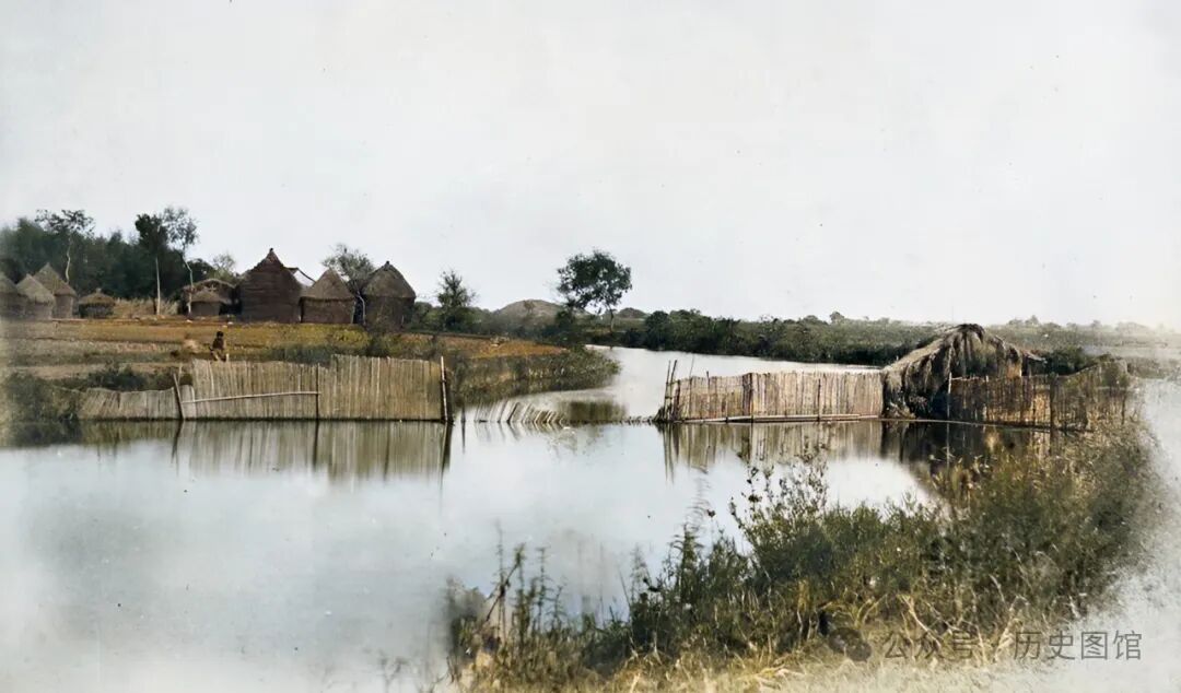 1850年,位于上海郊外河上的一处人工钓鱼堰。在河道中,人们用竹子扎起栅栏,中间留一缺口。栅栏将鱼群阻挡在上游水域,方便人们钓鱼。在钓鱼堰的旁边,还有一间草房。