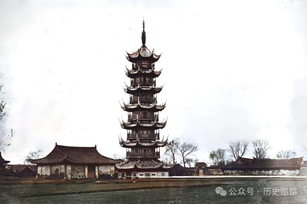1850年,上海佘山上的千年古塔——秀道者塔。秀道者塔,又名月影塔,始建于北宋太平兴国年间(976-984年),为七层八角砖木结构,塔高29米。该塔为典型的上海地区楼阁式塔建筑。