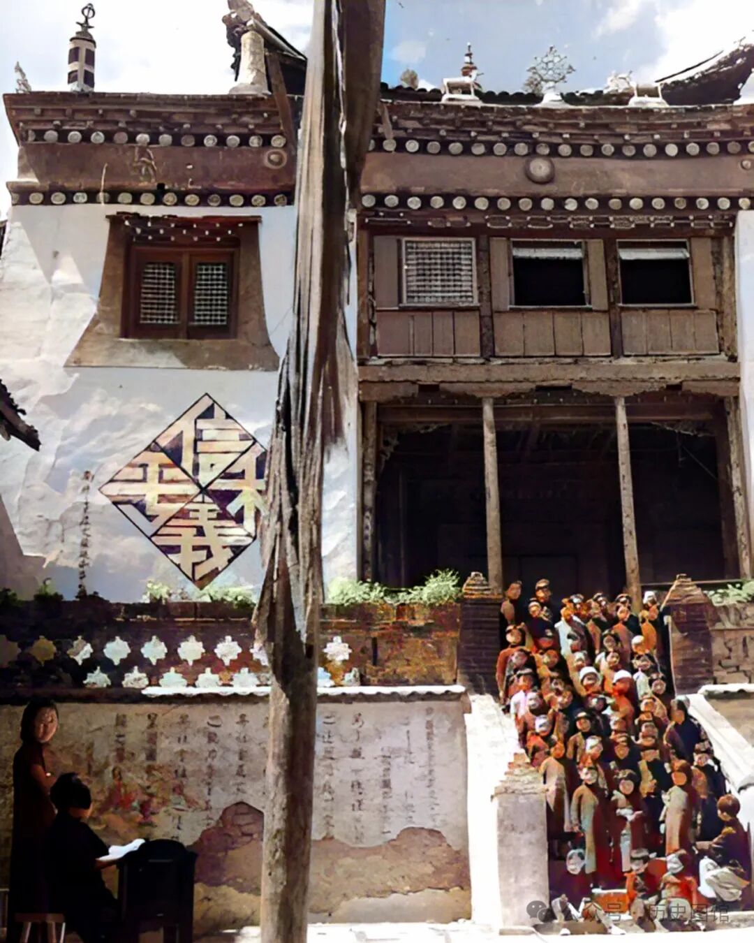 1939年1月,刚刚成立的“西康省立小学”。一群小学生站在教室前的台阶上合影。这座建筑,是原明正土司在康定最恢宏的宫殿,后被改成了学校。