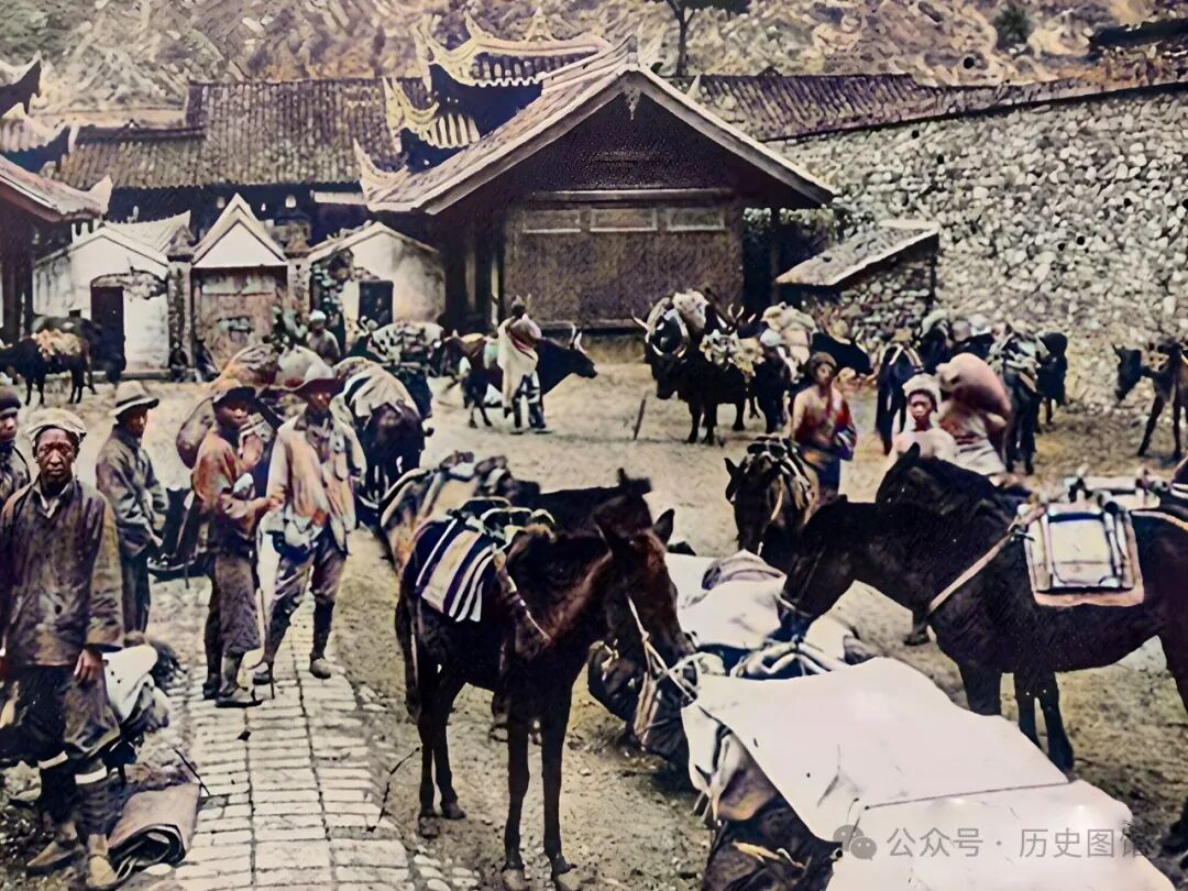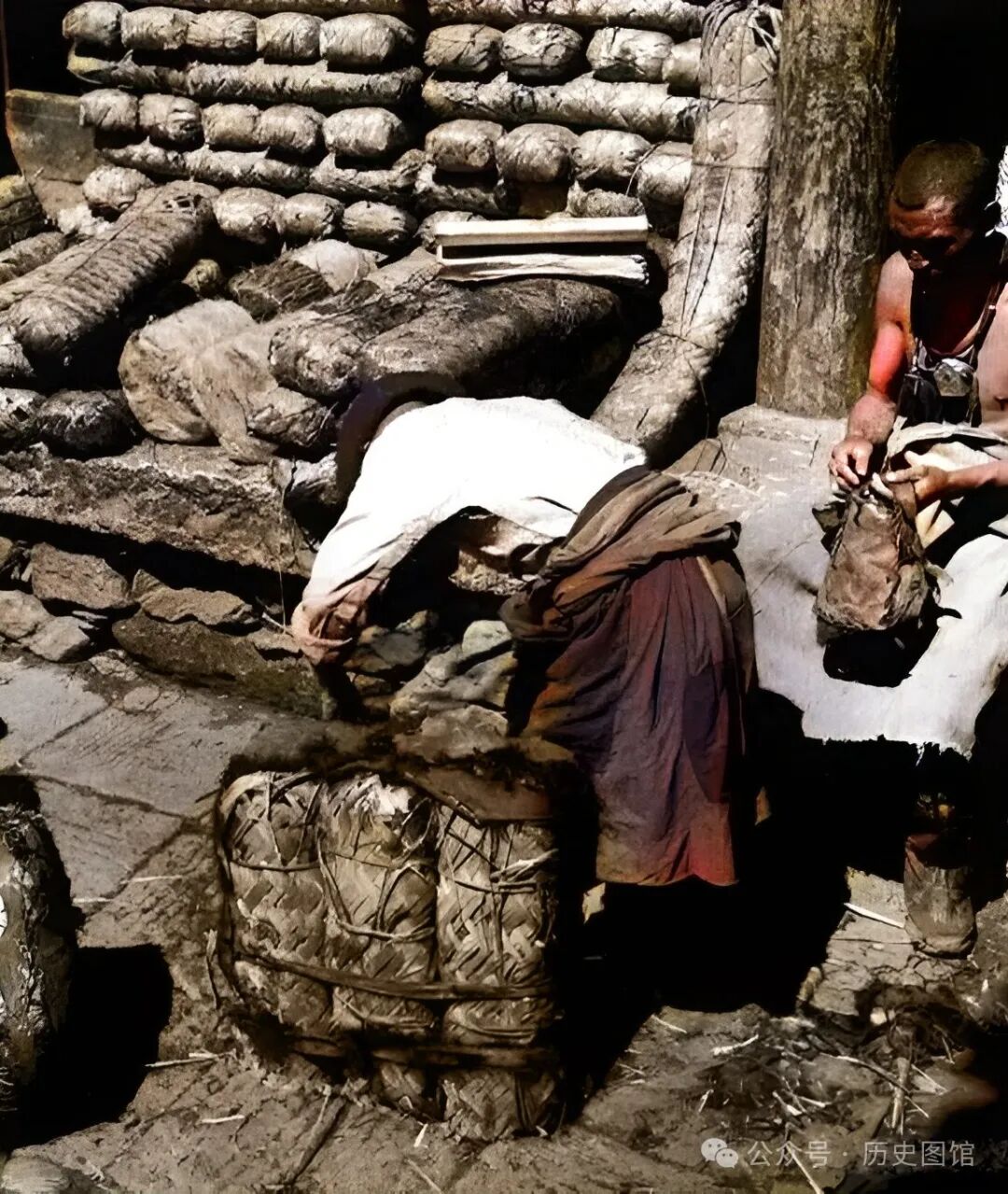 30年代,康定东关外“西康茶关”附近的景象。一名背夫正在给茶叶打包。每年,西康茶关收茶税达十一万两白银。