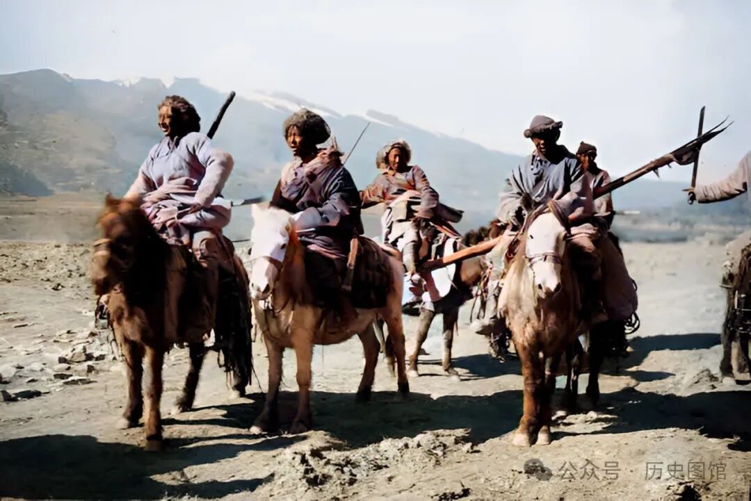 这几名骑马的汉子,是康定运输线上的卫队成员。他们骑着高头大马,身上背着刀枪,为过往的车队和马帮保驾护航。他们性格豪爽,武功高强,是康定运输线上的守护神。