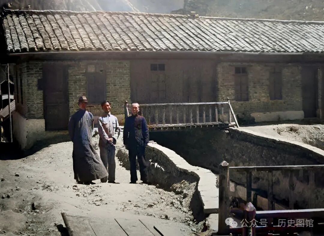 30年代,康定水利发电所的厂房前,三名工作人员站在沟渠旁。这张照片的拍摄位置为现甘孜日报社附近。