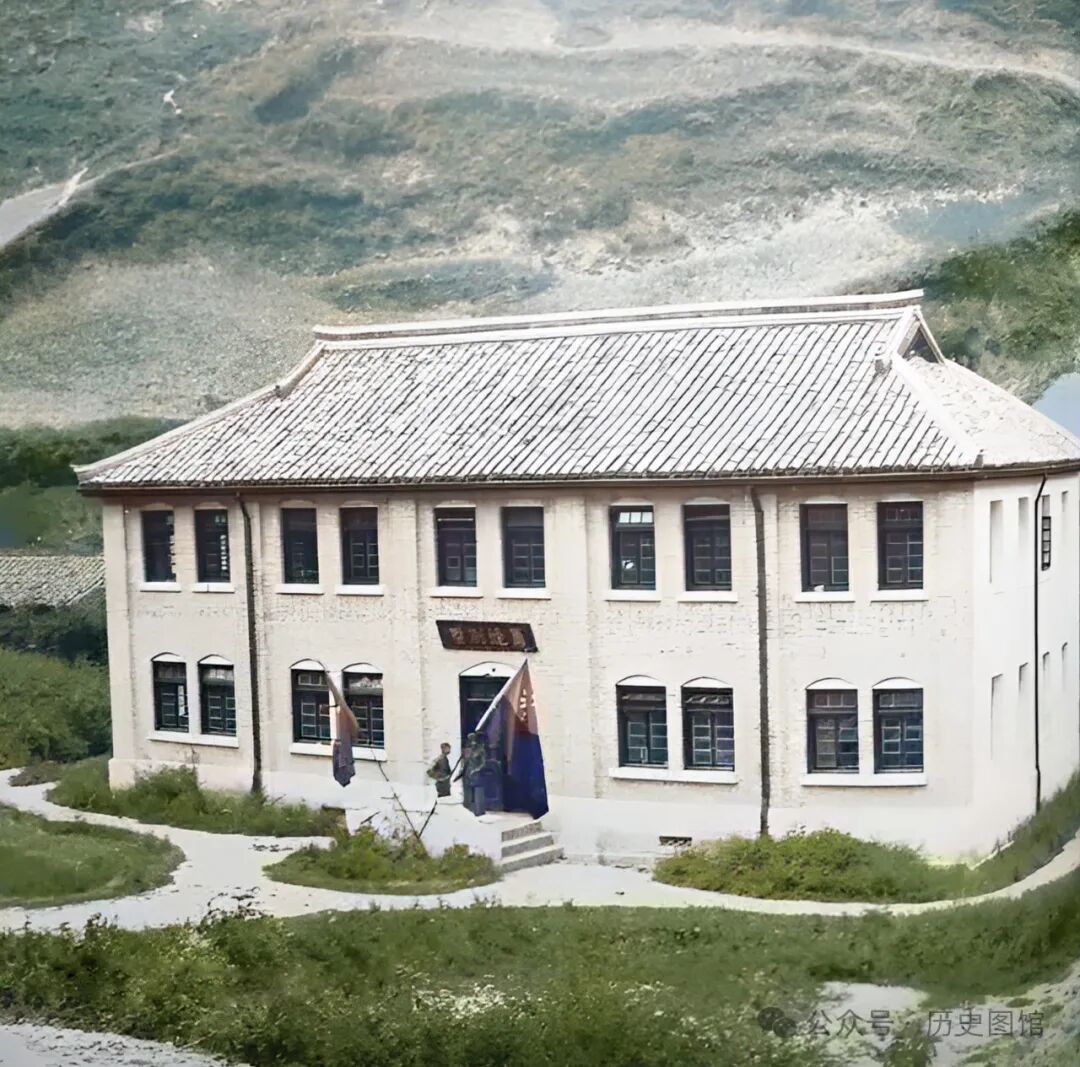大楼为砖瓦结构,门口上方悬挂的匾额上写着“筹边别墅”四个字,门口有两名士兵在站岗。台阶下的大石头上交叉斜插着两面旗帜。筹边别墅作为往来西康之军政机关的招待所。