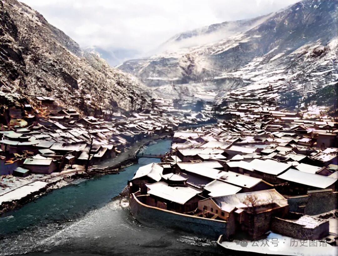 30年代,康定刚下过一场大雪,河水还没有结冰。这与昔日的绿水青山形成了鲜明对比。河两岸的传统建筑和民居,古色古香。目光所及之处银装素裹、分外妖娆。