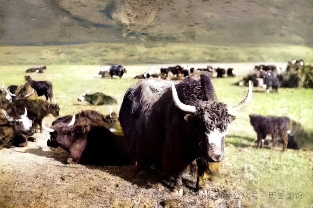 1939年,康定地区一片草地上的成群的牦牛。牦牛是世界上生活在海拔最高处的哺乳动物,能忍耐极寒天气。牦牛善行山路沼泽,且负载量大。牦牛以其特有的生理条件,成为该地区的重要交通工具。