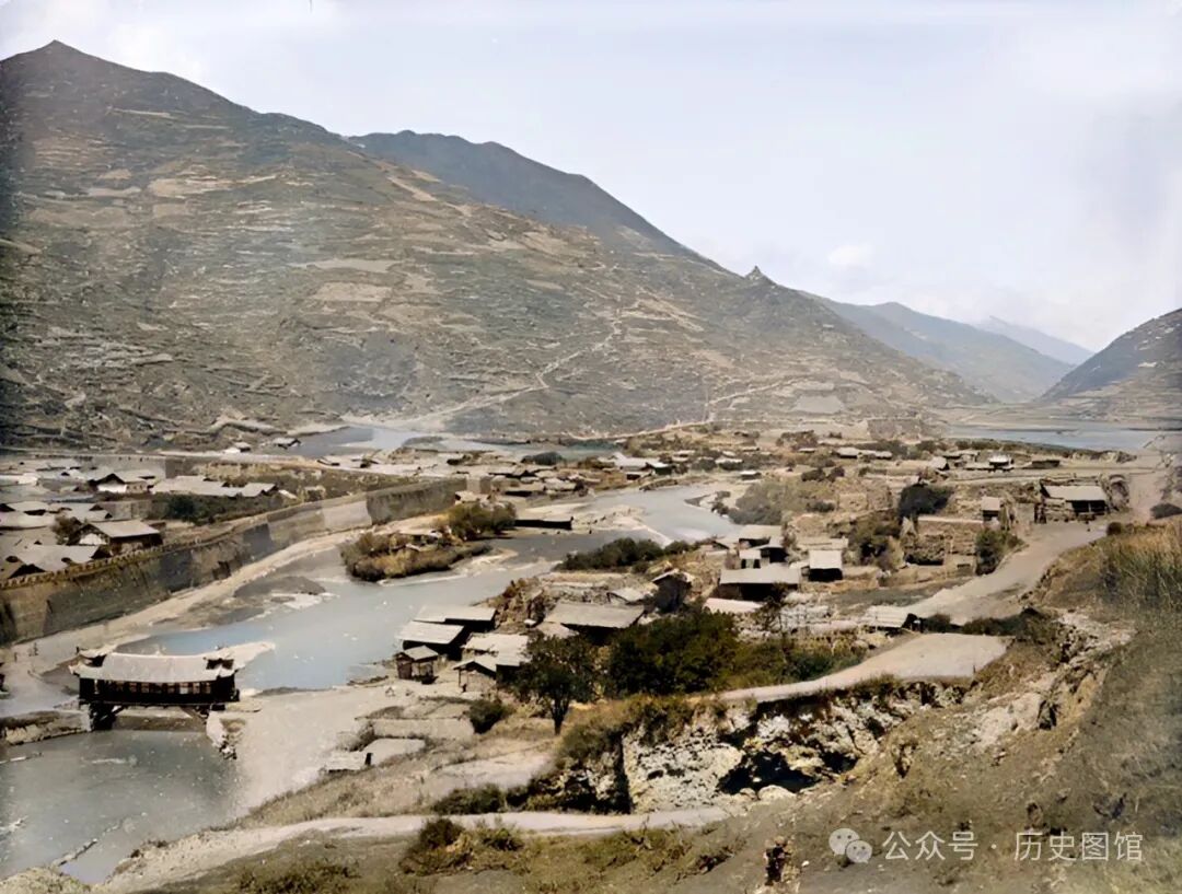照片中,在正对城门口的位置,有一座廊桥横跨在河道之上,这是进出松潘县城的必经之路。在河对岸,也分布着一些民居。远处的大山,连绵不绝。