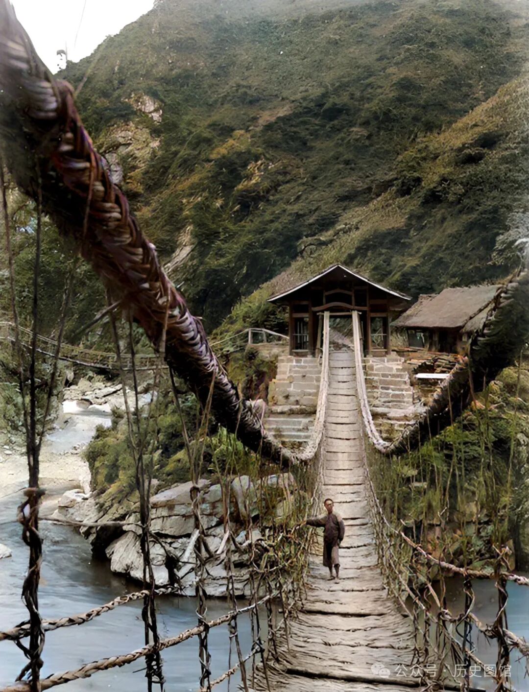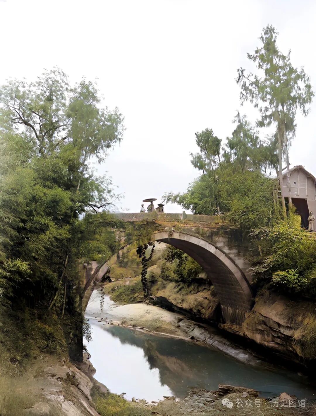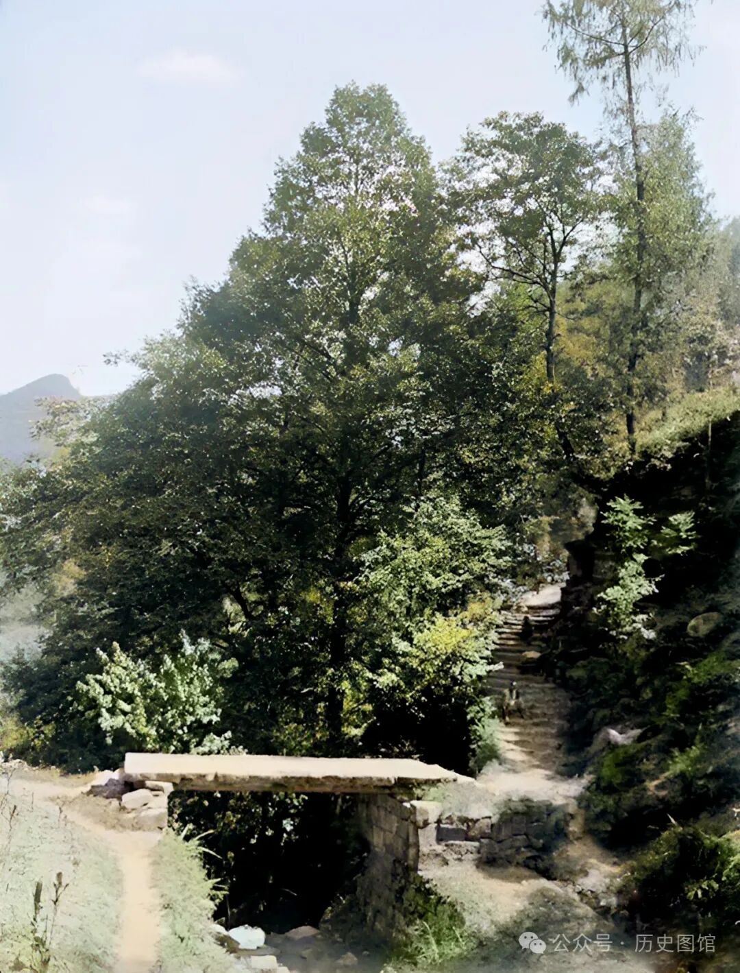 1910年7月5日,在重庆市开县附近,拍下了这张照片。在谷底小溪上,有一座石板桥。这里是上下山的必经之路。在石桥一头的台阶上,有两名赶路的男子,正坐在树荫下休息。