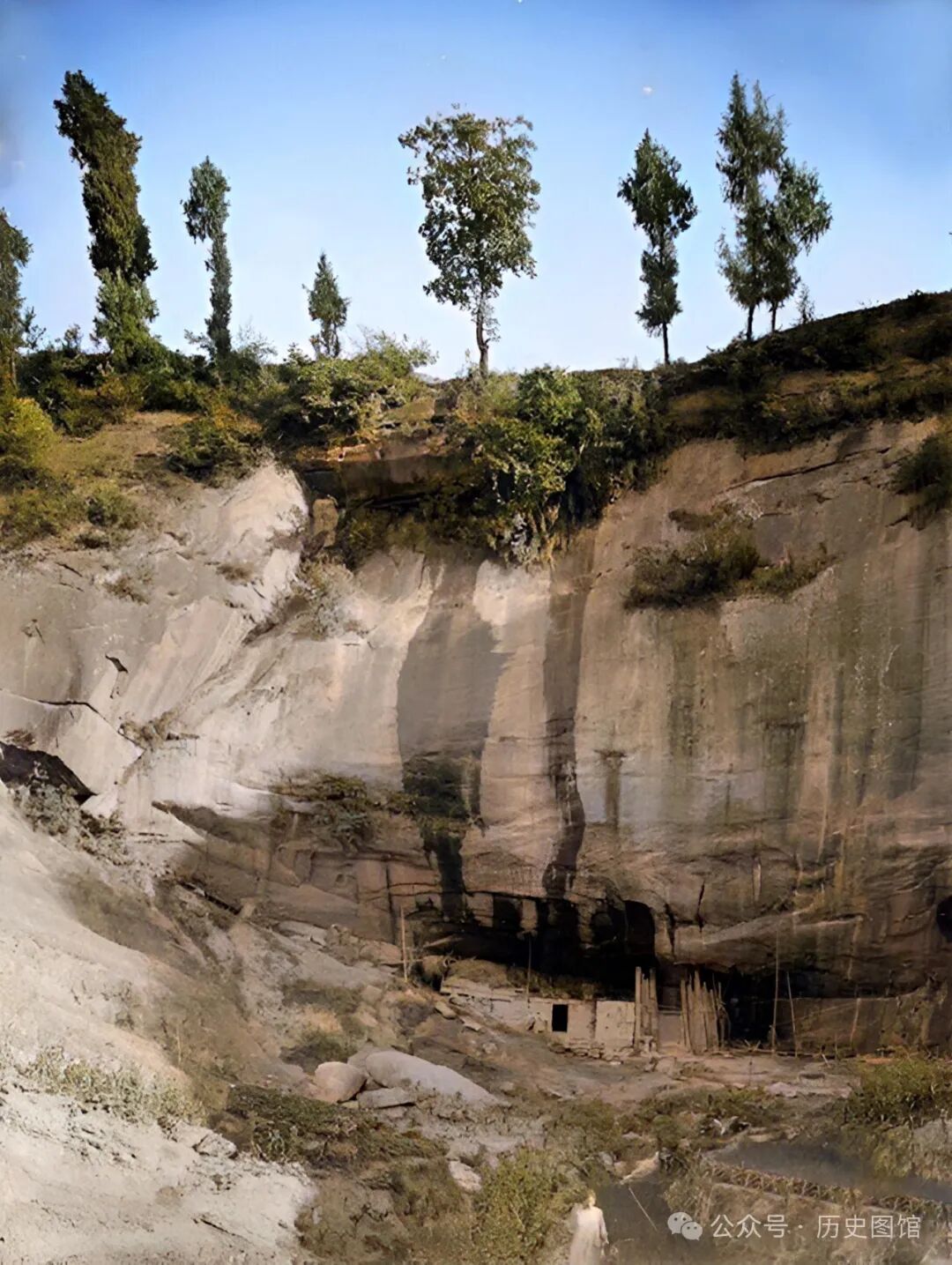 在四川宣汉县东南乡,威尔逊看到了一处奇特的建筑。在一座崖壁之下,有一个山洞。石壁上,有泉水不断流下。山洞里面有用石头垒砌的房屋,应该居住有人。一名男子正站在山洞前面的水池边。
