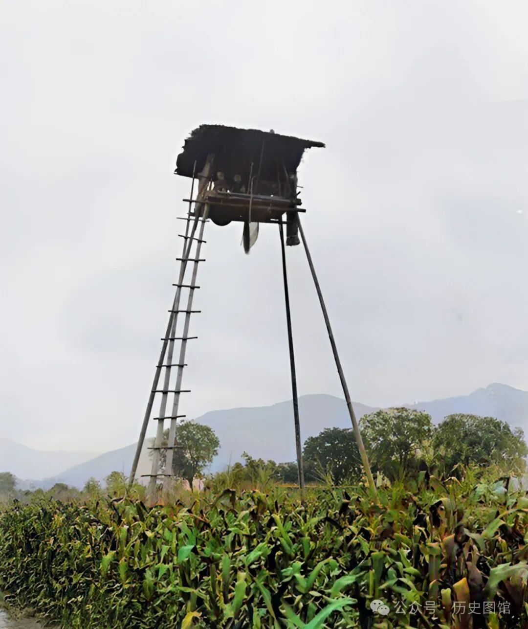 在成都市金堂县,考察队看到了奇怪的一幕。在一片玉米地里,几根木杆撑起了一间简易小棚屋,里面坐着两名男子。他们可以蹬着木梯上下。原来,当时正值玉米成熟时节,两名男子坐在高处警戒,预防动物和坏人偷窃将成熟的玉米。