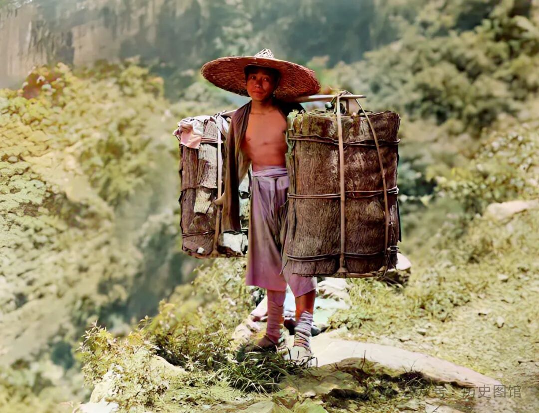 在云阳县考察期间,威尔逊在茶马古道上遇到了一名挑夫。他带着硕大的斗笠,扁担两头挑着的货物,可能是茶叶。