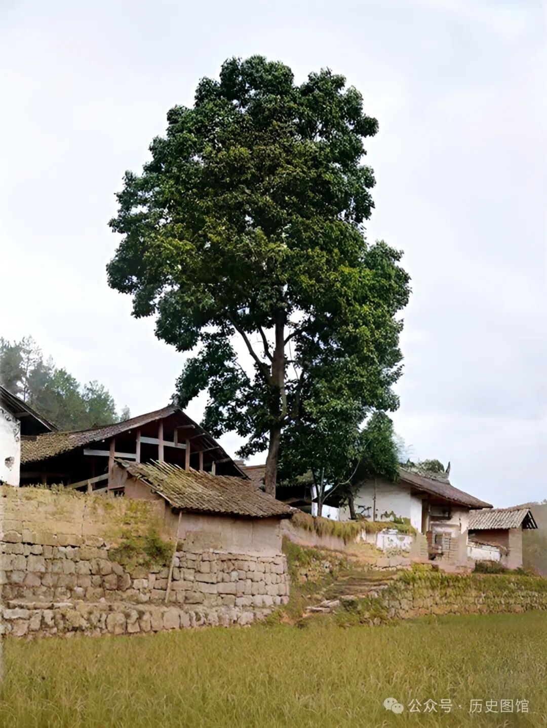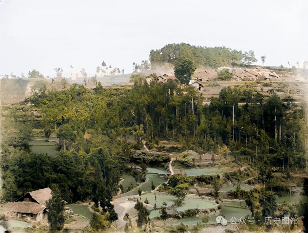 这张照片也是拍摄于绵竹境内,在村子外面,是一望无际的稻田。高大的树木掩映下,能看到村子里的房屋。这样的画面,和现在的乡下农村很相像。