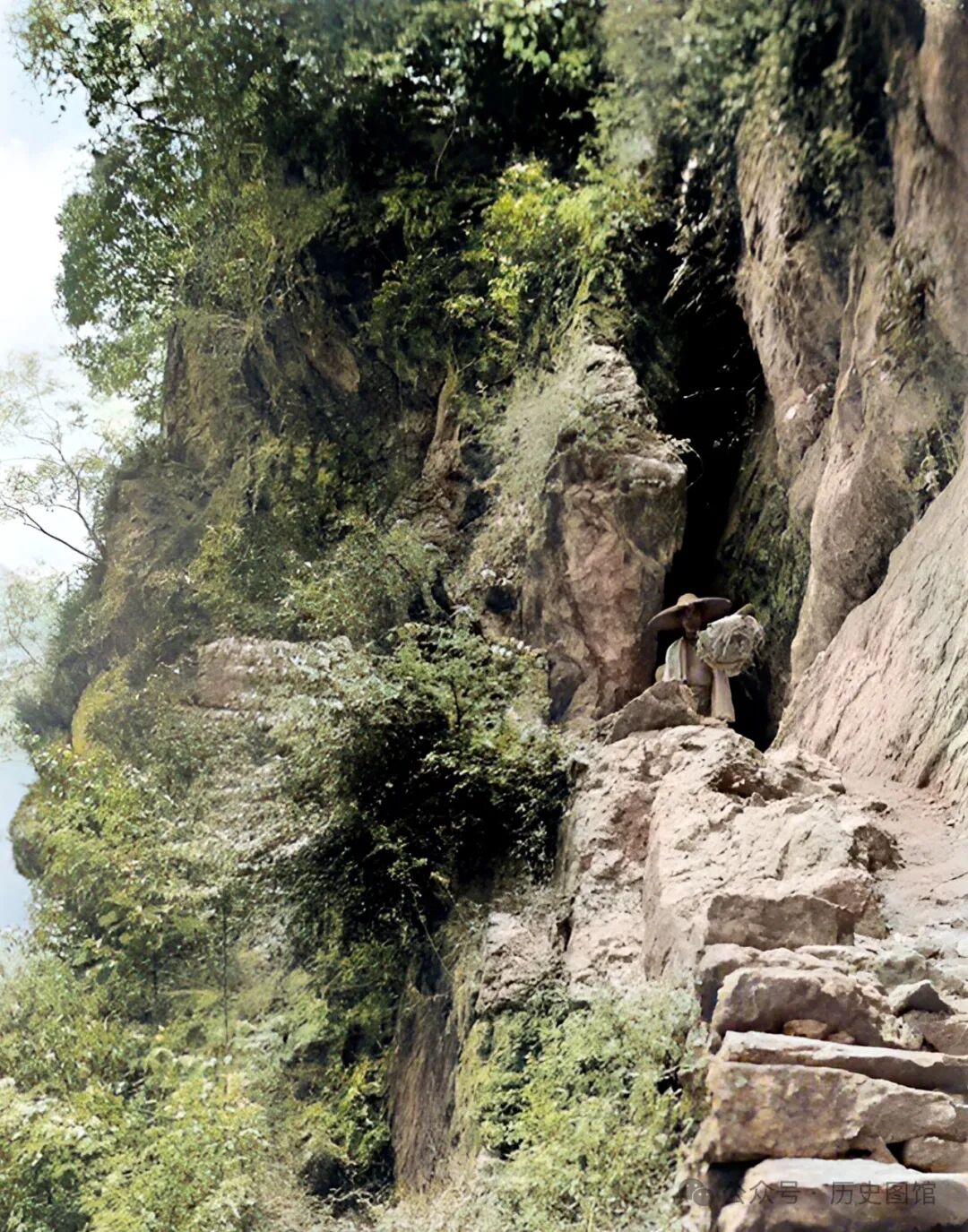 云阳县上坝乡季湾村附近,一名挑夫从正山洞里走出来,洞口有沿着山体开凿的石道。人们穿过这个山洞,可以到达山的两边。俗话说“蜀道难难于上青天”,这就是真实的写照。