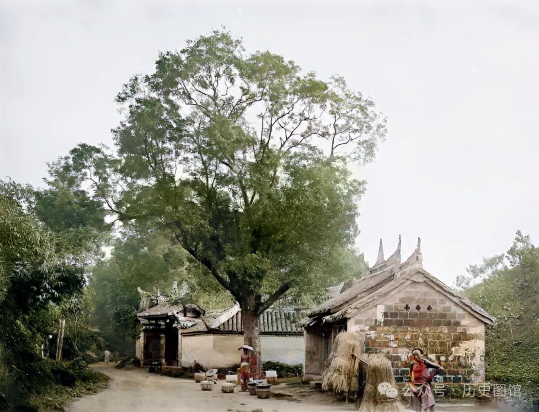 这张照片,也是拍摄于当时的成都。在一条马路旁边的大树下,有一座庙宇。几名挑夫正站在路边休息。一人挑的是干柴,另一名挑的好像是油篓。远处那个院落,看上去也像是一座寺庙。这样的画面,充满了乡土气息。