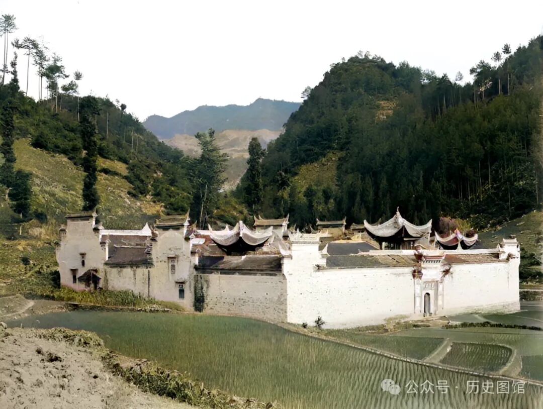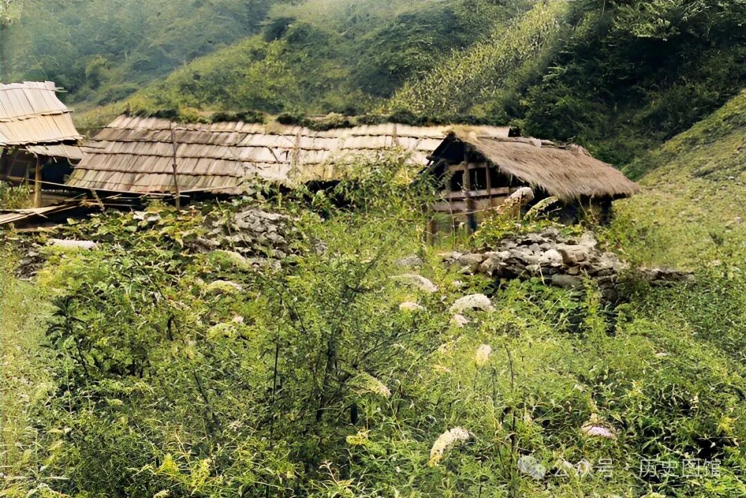 1910年7月3日,考察队来到了重庆的云阳县附近。在一个小村附近,拍下了这张照片。几栋当地传统民居,石头垒砌的墙壁和台阶,很有年代感。房屋后面,是一望无际的稻田。目光越过房屋,依稀能看到远处起伏的山峦。