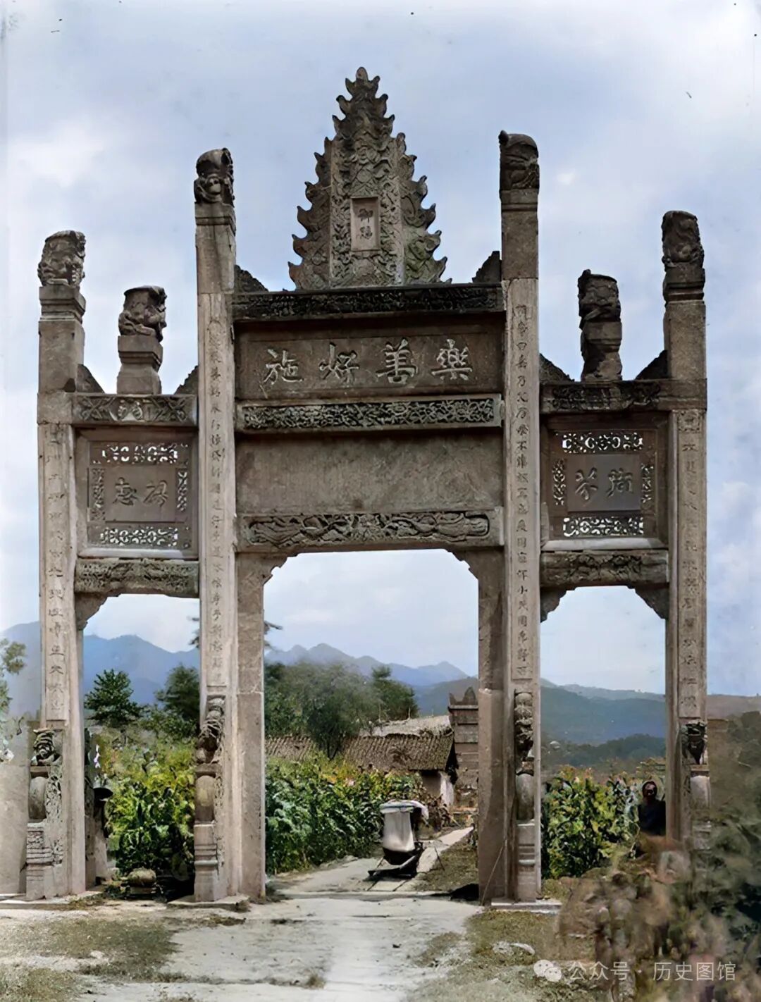 8月10日,考察队来到了绵竹市的兴隆镇。在村口,他们看到了一座高大的三间四柱石牌坊。中间门洞上方,写着“乐善好施”四个大字。最上边的火焰状造型中间有“御赐”二字。在石牌坊的四根立柱上,镌刻着几十个字的楹联。