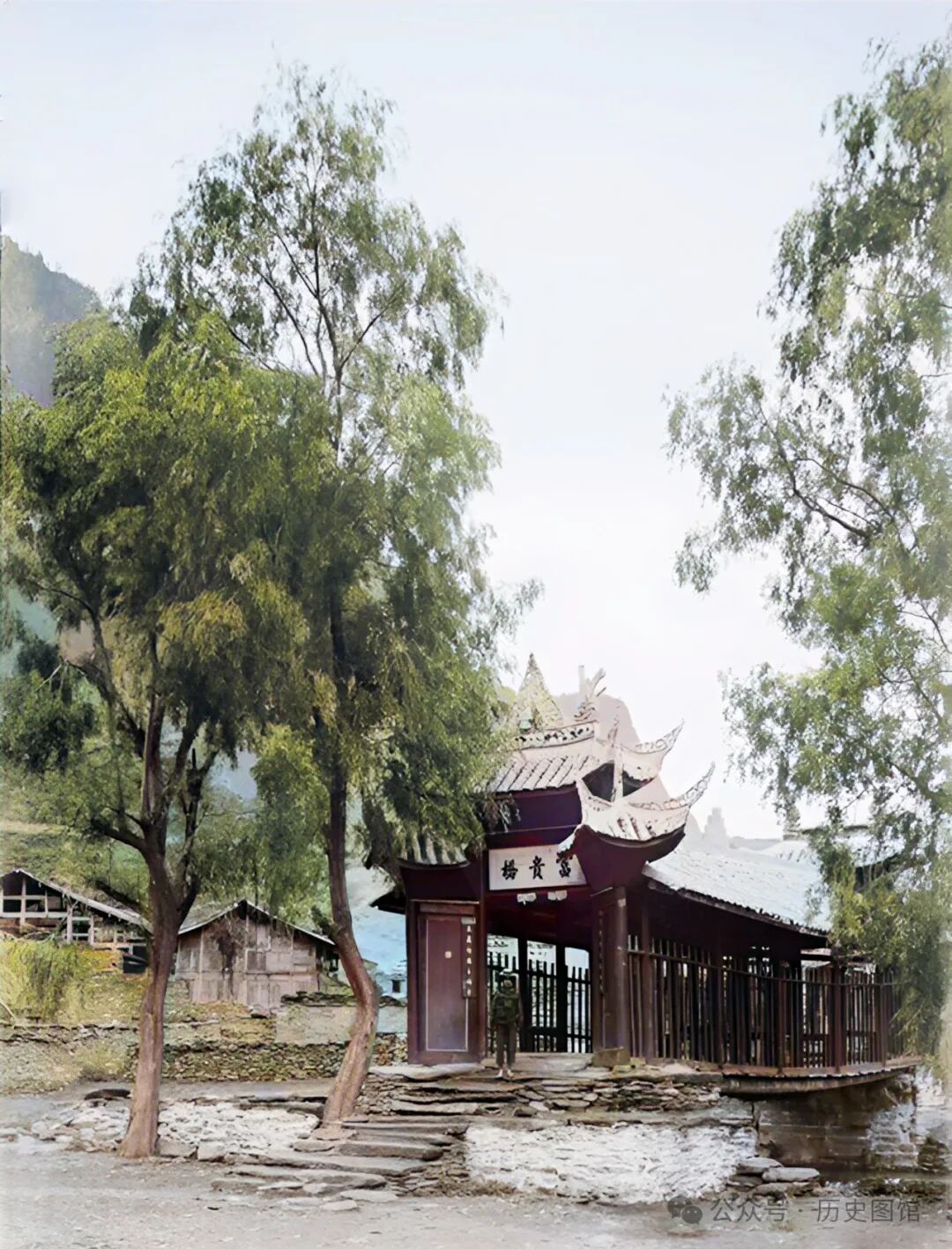 这张照片,拍摄于松潘县的新塘关附近。在一条河道之上,修建有一座设计精美的廊桥。桥头上方悬挂的匾额上写着“富贵桥”三个大字,桥头还种植有几棵柳树。