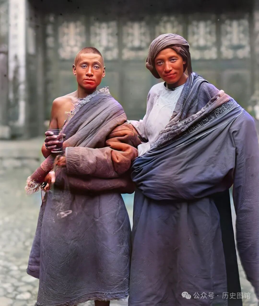 1910年8月25日,威尔逊考察队中的两名藏族向导。他们身上穿着传统的民族服饰,在一处建筑前休息,一名向导接过威尔逊递给他的一杯水。