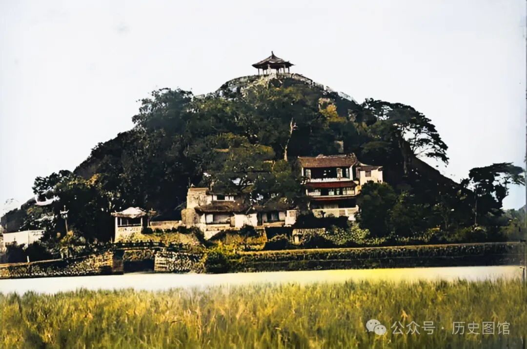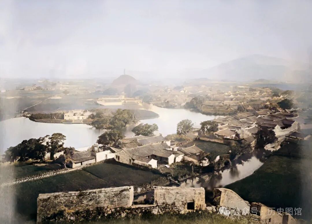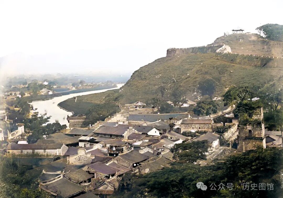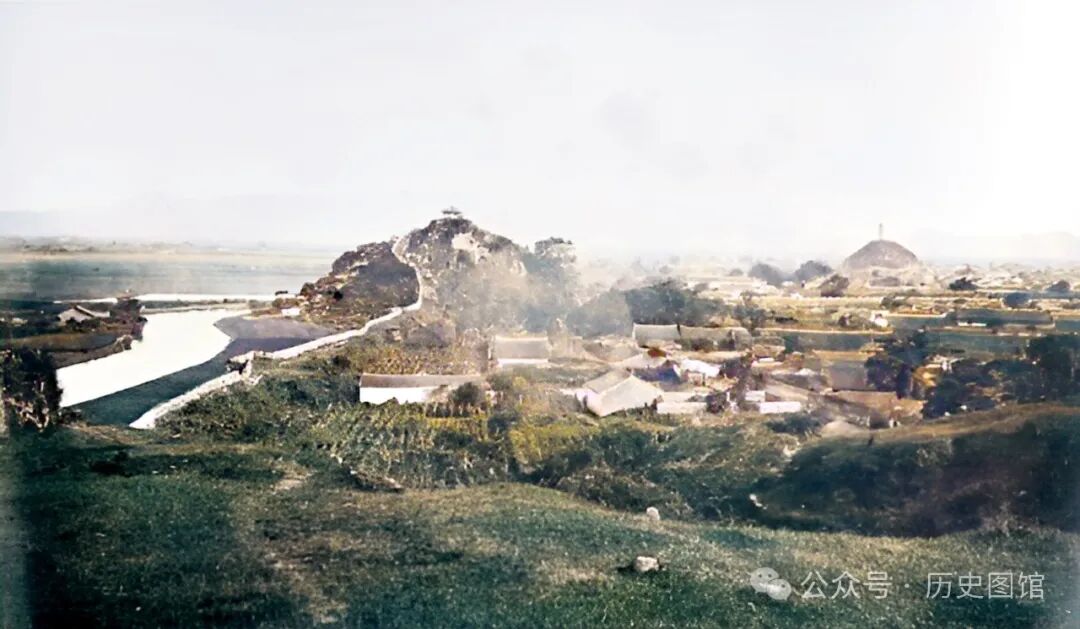 1887年,站在华盖山上向东面眺望,远处是著名的杨府山。仔细看照片的左下角,露出了一段城墙,城墙下面就是护城河。