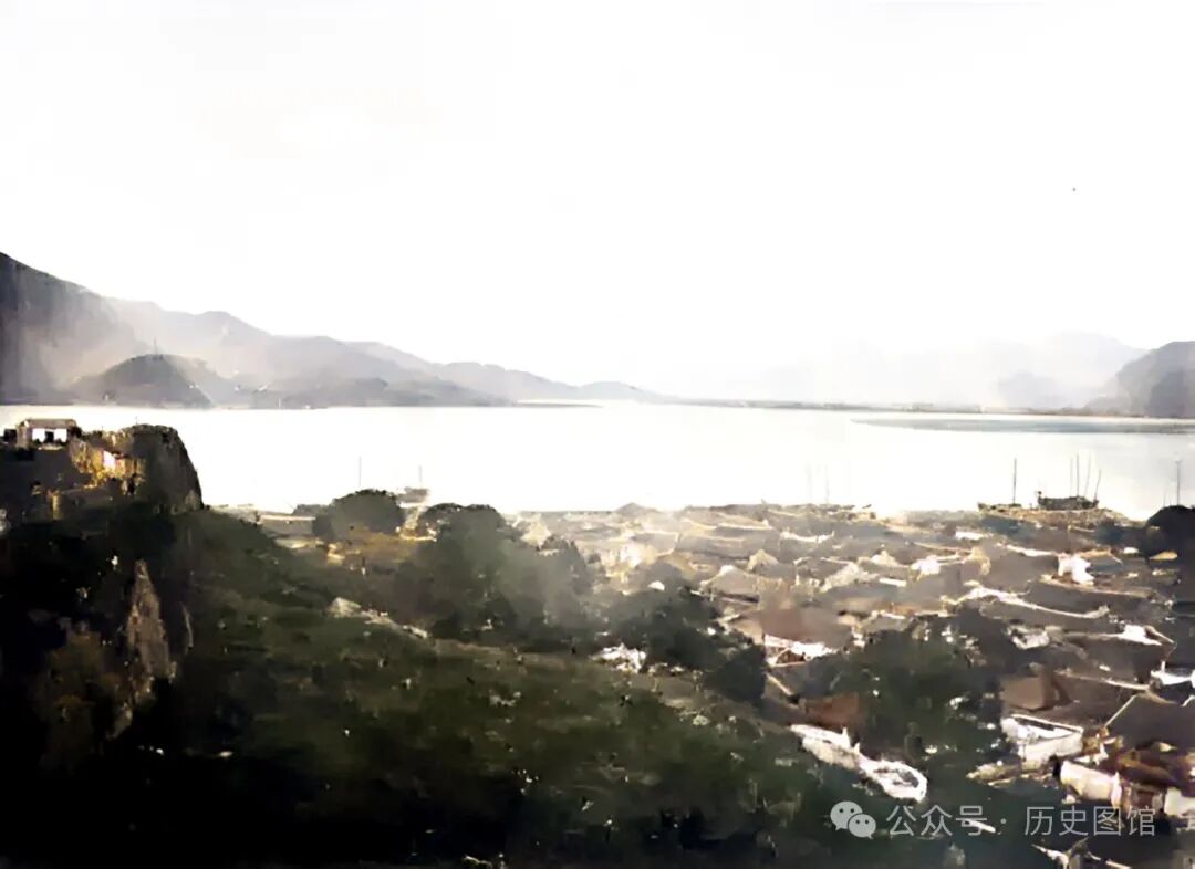 清朝时期,站在山上远眺江景,令人心旷神怡。在照片左侧,能看到古老的温州城墙。城墙下面有护城河,江岸上是一栋栋民居。瓯江风景秀丽,烟波浩渺,一眼望不到边。
