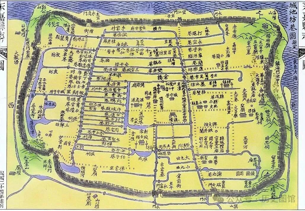 温州城墙雄伟壮观,四周共有设7座城门。从东边起(逆时针方向)分别为:镇海门、瑞安门、永宁门、来福门、迎恩门、永清门、拱辰门。从这张地图就能一窥温州城当年盛况。