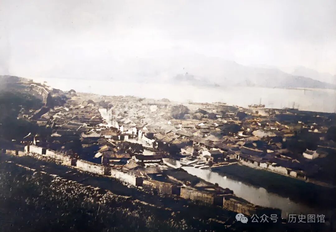 1877年,站在温州海坛山上,远眺对面的华盖上。跨山而建的城墙清晰可见,山顶的大观亭依稀可见。山下是涨桥头民居、镇海门、镇海塔、东护城河(现环城东路)。