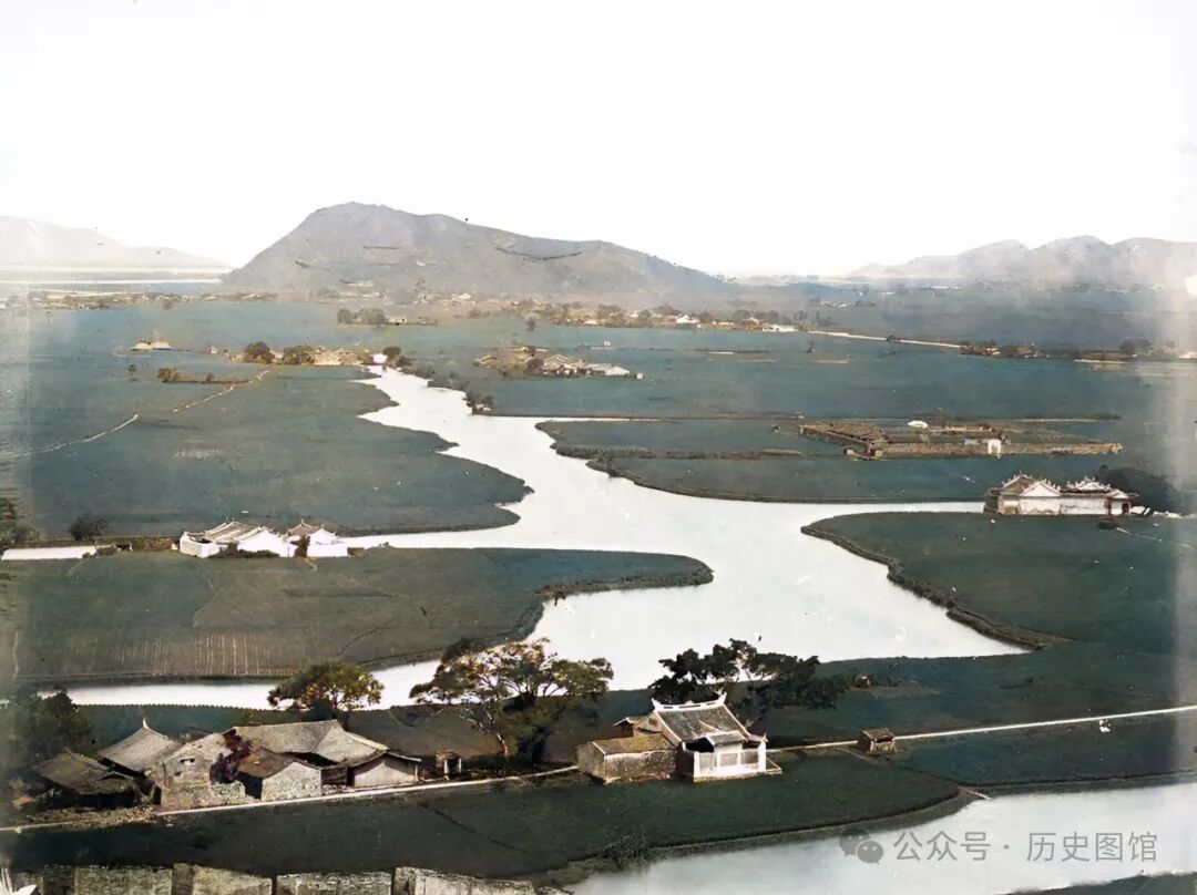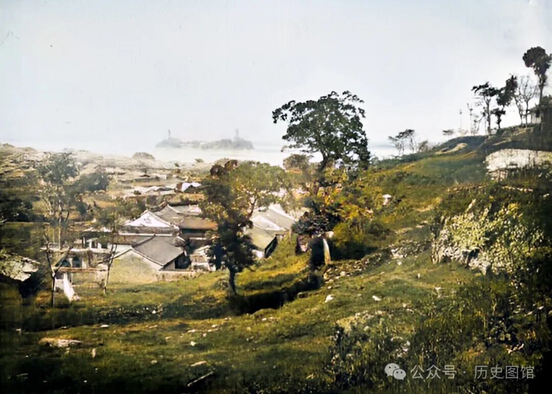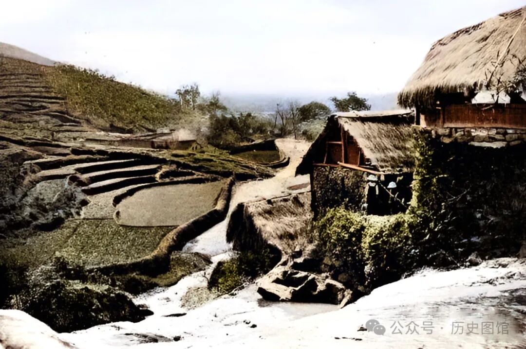 清朝时期,温州城外的景象。在山脚下,有一个古朴的小村落。照片右侧,能看到几间草房民居。不远处的山坡上,开辟着一层层的梯田,地里种植的庄稼绿油油的。