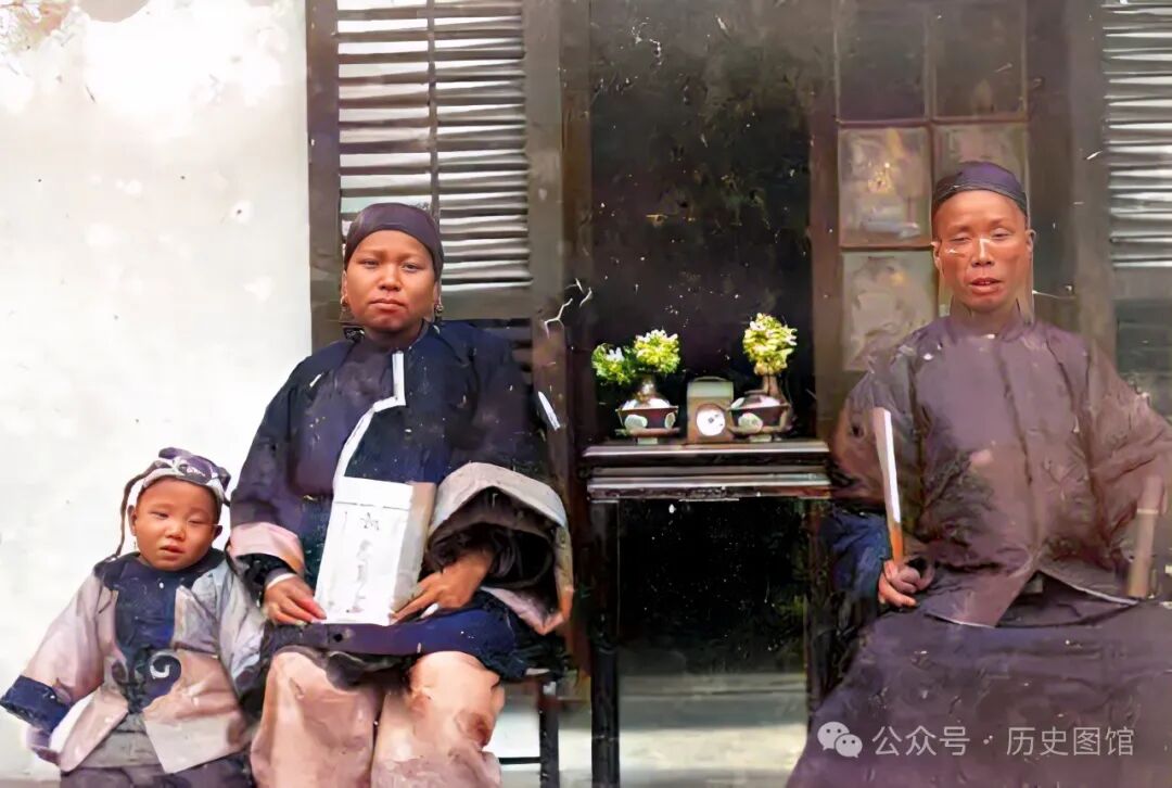 清朝时期,温州城内一户人家合影照。从房间的布局和陈设来看,并非平常人家。丈夫身穿长衫,手拿折扇,一看就是有诗书气质之人。他的妻子坐在方几右侧,手拿一本经书。他们的孩子坐在母亲身边,长相很可爱。