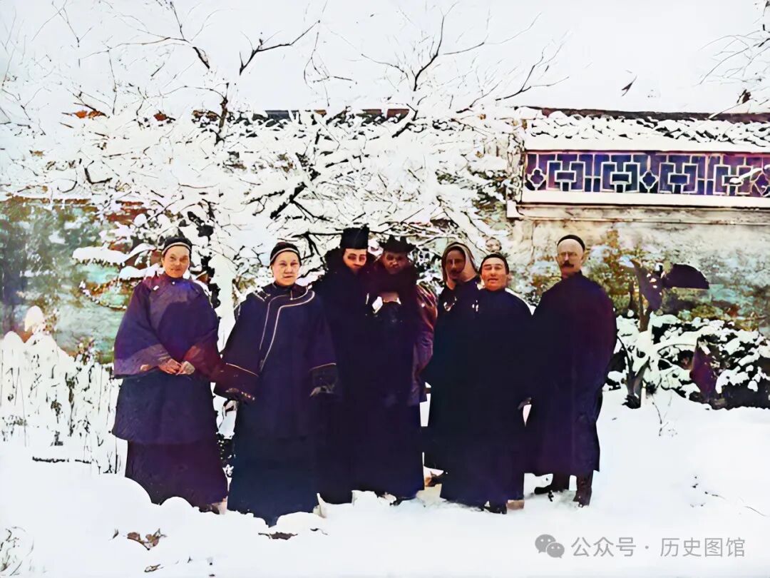 1900年,一场大雪过后,房子、地面和树上,到处都是积雪。几名英国传教士与温州当地人在公园里合影。